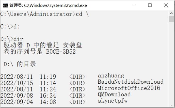 如果要更换当前目录到硬盘的其他分区,则可以输入盘符然后按Enter键,比如:要到D盘,那么就需要输入“d:”命令,然后按Enter键,现在提示符就变成了D:\>,如图2-22所示,然后输入dir命令,就可以看到D盘的文件的列表,如图2-23所示。