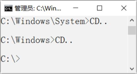 如果要退出子目录,可以输入“CD..”,然后按Enter键即可,在DOS中,“..”表示当前目录的上一层目录,“.”表示当前目录,这里的上一级目录为父目录,例如输入“CD..”,按Enter键,返回上一级目录,再次输入“CD..”,可回到C盘根目录,如图2-20所示。当然,如果不想多次输入“CD..”命令来返回C盘根目录,那么可以直接输入“CD\”命令来返回C盘根目录,其中“\”就表示根目录,如图2-21所示。