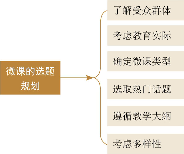 选题规划是制作微课的第一步,好的选题有助于提高微课的吸引力和教育效果。微课的选题规划要考虑以下6个方面,(如图1-12所示)。