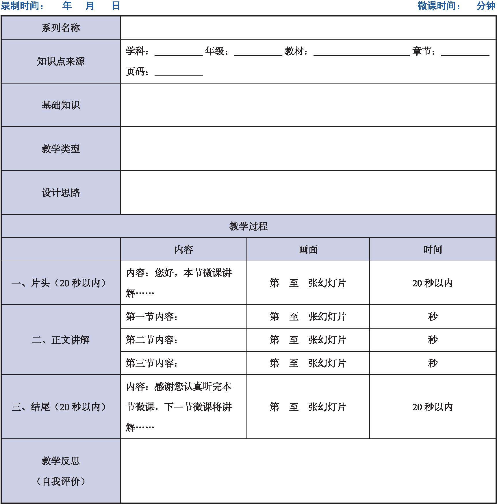 下面是为读者提供的一份微课脚本设计模板。