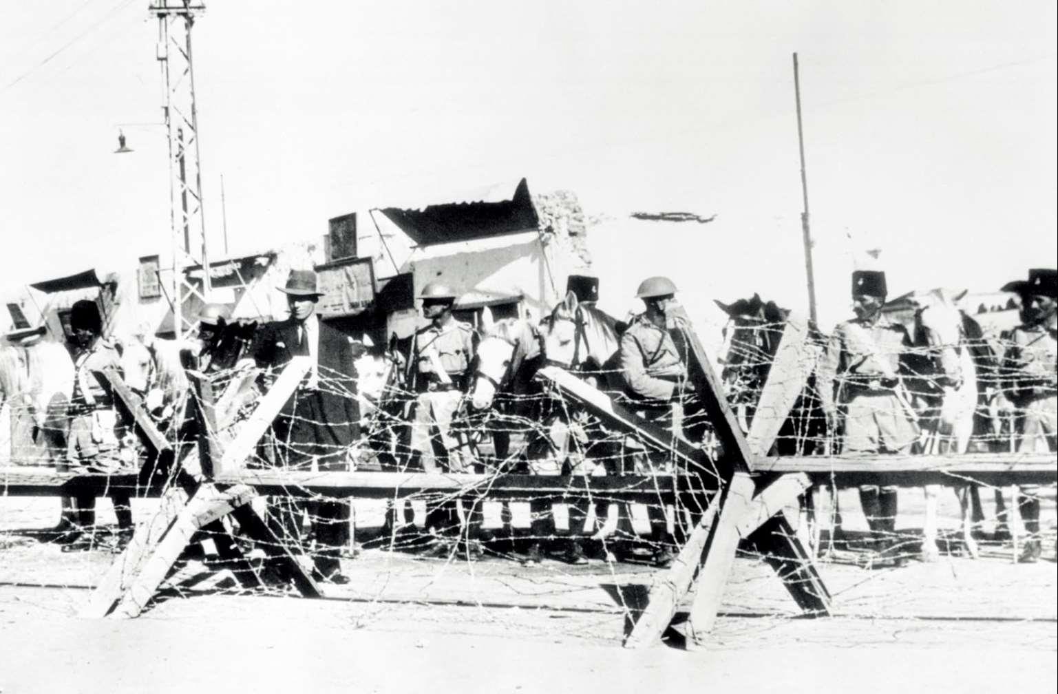 1936 年 6 月 9 日,英国军警在交叉路口设置的铁丝网路障。当时,阿拉伯闹事者与英国士兵的冲突进一步激化。阿拉伯人要求英国当局立即叫停犹太人的继续涌入。当月,英国部队打死 140 多名阿拉伯人,33 名英军士兵丧生