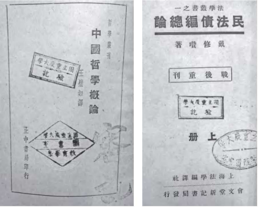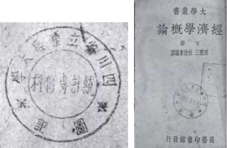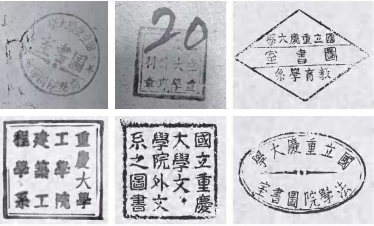 经历了抗战内迁、融合、升级为国立大学等重大事件,1942—1949年这一阶段的重庆大学院系学科发展迅速,奠定了重庆大学多学科综合性大学的基础。各学院系科纷纷设置本院、系、科的图书室,并配备对应的藏书章。在馆藏现存资料中我们能找到的章至少有十余枚,如法学院、教育学系、工学院建筑工程学系、商学院同学会、文学院外文系、统计专修科。