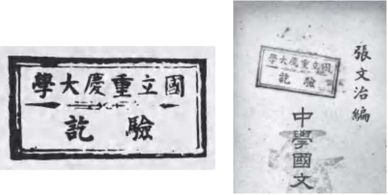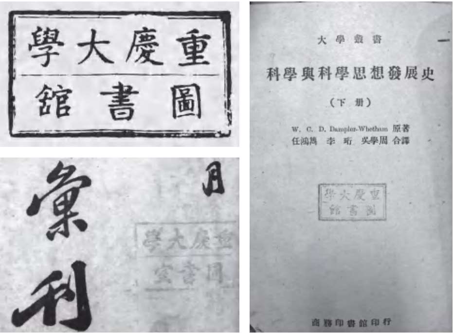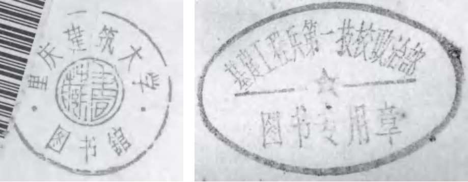 一枚是“重庆建筑大学图书馆”章,一枚是“中国人民解放军基建工程兵学校”曾用图书馆章。两所学校于 2000 年合并入重庆大学,即为如今的重庆大学B区和C区,三校的图书现都统一盖上了重庆大学图书馆的馆藏章。