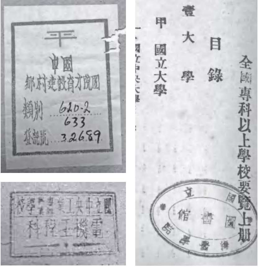 院系科书籍入藏图书馆之后,图书馆统一加盖了馆藏章,部分还有清晰钢印,所以一本书上出现了系科图书室章、图书馆章、图书馆钢印、“验讫”等多种馆藏标志。如果发现这些字样同时出现的书籍,则可以迅速判断出该书为 1942 年至 1949 年之间入藏。
