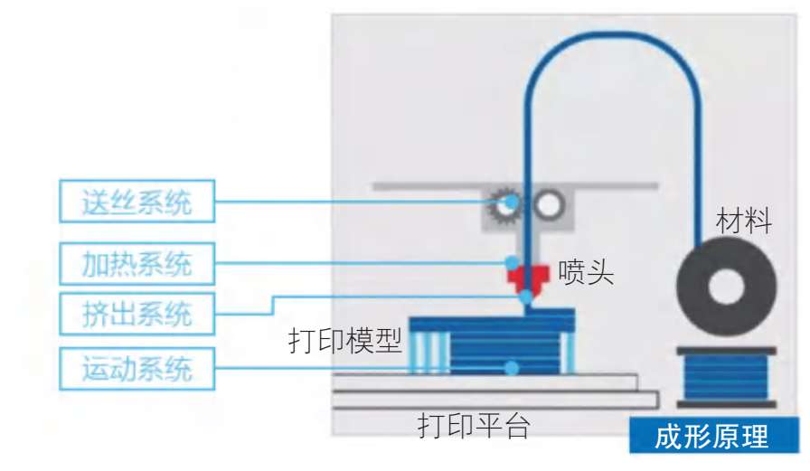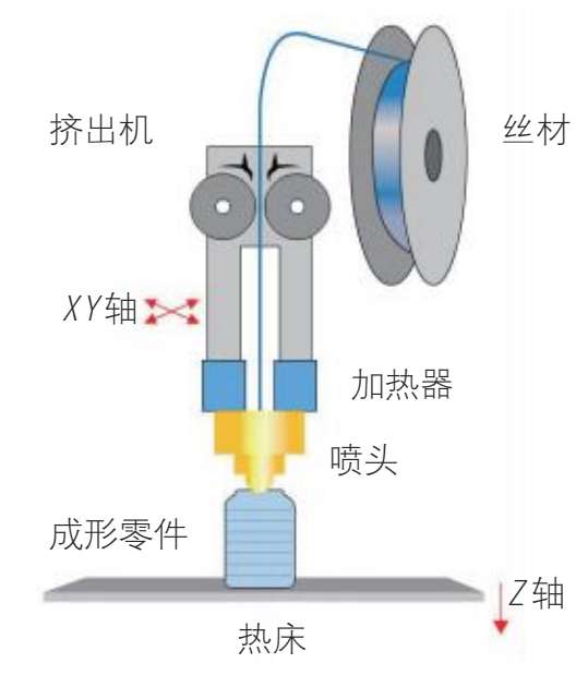 FDM系统主要由送丝系统、加热系统、挤出系统、运动系统 4 个部分组成,如图 1.1.10 所示。