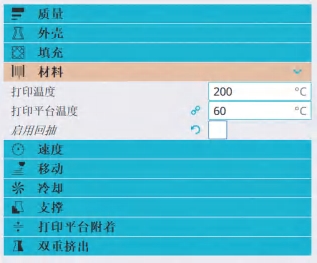 温度升高,热塑性材料流动性增强,黏结性好,收缩性大。喷嘴温度主要与打印材料的种类和性能相关,不同厂家及颜色的材料最佳成形温度有一定区别,需要操作者根据实际情况进行微调,如图 1.1.21 所示。打印平台温度主要减少零件成形过程中的变形和翘曲,成形小型零件可以不加热打印平台,大型零件和变形较大的零件都要进行打印平台加热。