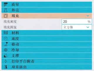 与其他材料成形方法不同,3D打印成形过程中可以选择不同的密度,零件内部可以选择中空或网格,零件表面完全填充,从而缩短成形周期,实现材料利用最大化。零件内部的填充图案根据强度要求可以选择网格、三角形、正方形等形状。对无特殊要求的零件,可以选择填充密度 20%,填充图案为立方体,如图 1.1.20 所示。