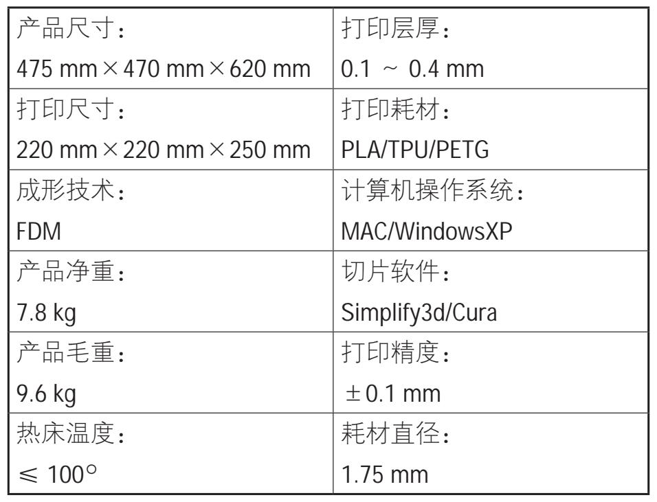 桌面级FDM打印机成形零件尺寸为 250 mm× 250 mm× 300 mm左右,能够满足普通人DIY和学生学习的基本需求,是一般学校教学、个人研究的主要设备。如图 1.1.16 所示为创想三维的Ender-3 打印机,其参数见表 1.1.1。