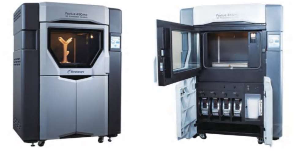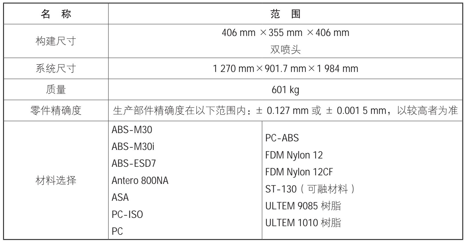 与桌面级FDM打印机不同,工业级FDM打印机可以将 3D打印技术与生产级热塑性塑料结合,快速成形具有较高尺寸精度和可重复性的高强度、耐用、尺寸稳定的部件,用于航天、医疗、汽车、电子和其他专业。如图 1.1.17 所示为Stratasys公司的Fortus 450 mc,其产品参数见表 1.1.2。