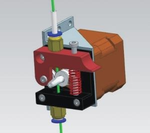 将实心丝状原材料缠绕在供料辊上,由电动机驱动辊子旋转,辊子和丝材之间的摩擦力使丝材向喷头的出口送进。在供料辊和喷头之间有一导向套,导向套采用低摩擦材料制成,以便丝材能顺利、准确地由供料辊送到喷头的内腔(最高送料速度为 10 ~ 25 mm/s,推荐速度为5 ~ 18 mm/s)。