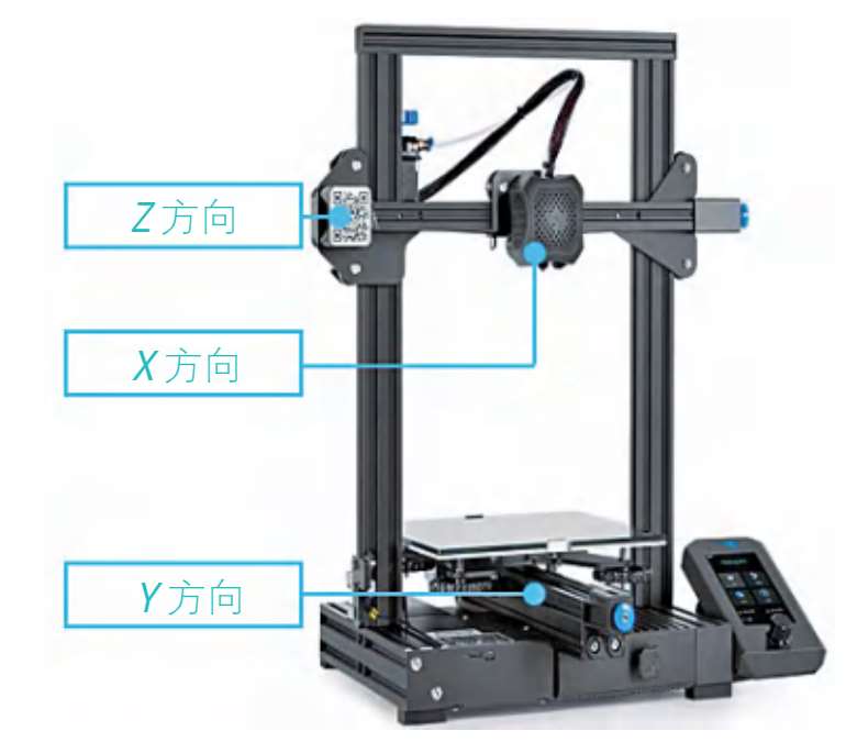 FDM成形三维实体的过程:首先成形 X / Y 平面薄片,然后通过喷头或基板在 Z 方向的移动进行下一个 X / Y 平面薄片成形。运动机构包括 X 、 Y 、 Z 三个轴的运动。不同的FDM成形设备实现 X 、 Y 、 Z 三个方向运动的方式有所不同,桌面级一般采用基板进行 X 、 Y 平面运动,喷嘴进行 Z 方向运动,如图 1.1.14 所示。