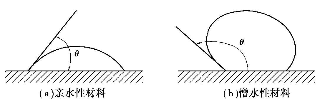 材料的亲水性与憎水性一般用润湿角 θ 来判定,如图2.8所示。当水滴与固体材料在空气中接触且达到平衡时,从固相、液相、气相的三相交点处,沿着水珠表面做切线,此切线与材料和水接触面的夹角称为润湿角。一般认为,当 θ ≤90 ° 时,为亲水性材料;当90 ° < θ <180 ° 时,为憎水性材料。