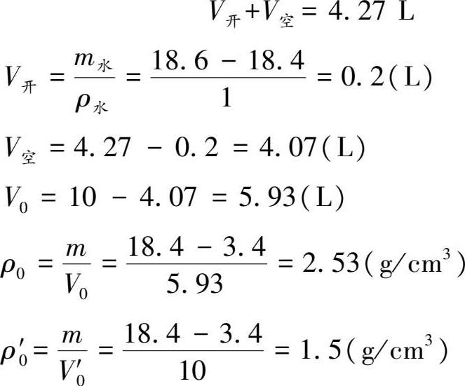 【 实例 2.4】 经测定,质量为3.4 kg,容积为10 L的量筒装满绝干石子后的总质量为18.4 kg,若向筒内注水,待石子吸水饱和后,为注满此筒共注入水4.27 kg,将上述吸水饱和后的石子擦干表面后称得质量为18.6 kg(含筒重),求该石子的体积密度、堆积密度及开口孔隙率。