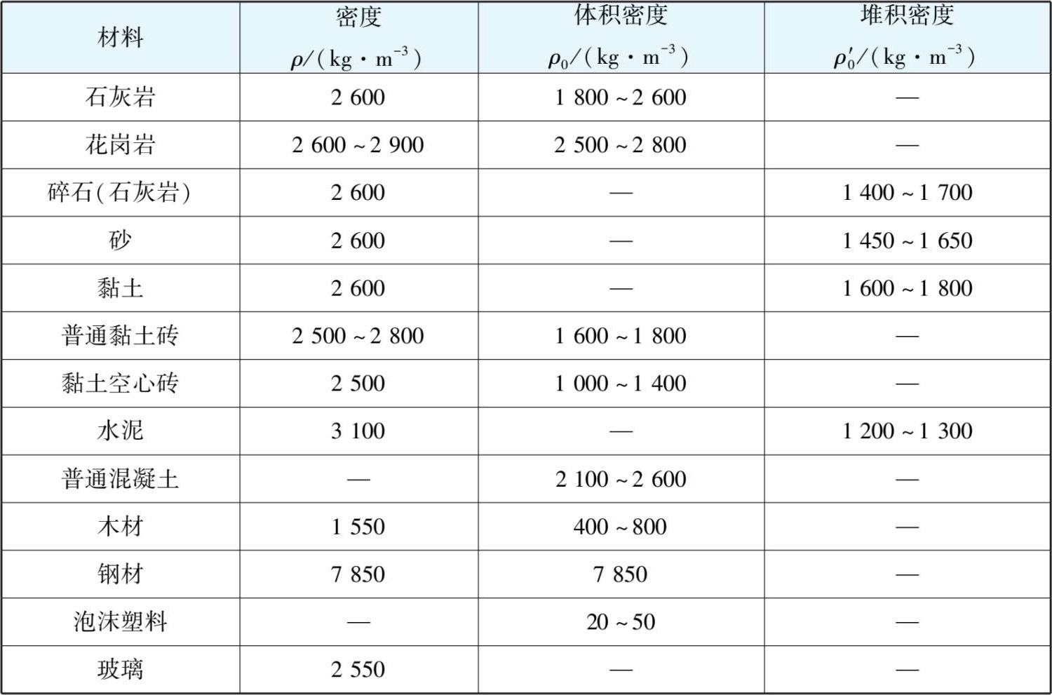 表2.1 常用建筑材料的密度、体积密度、堆积密度