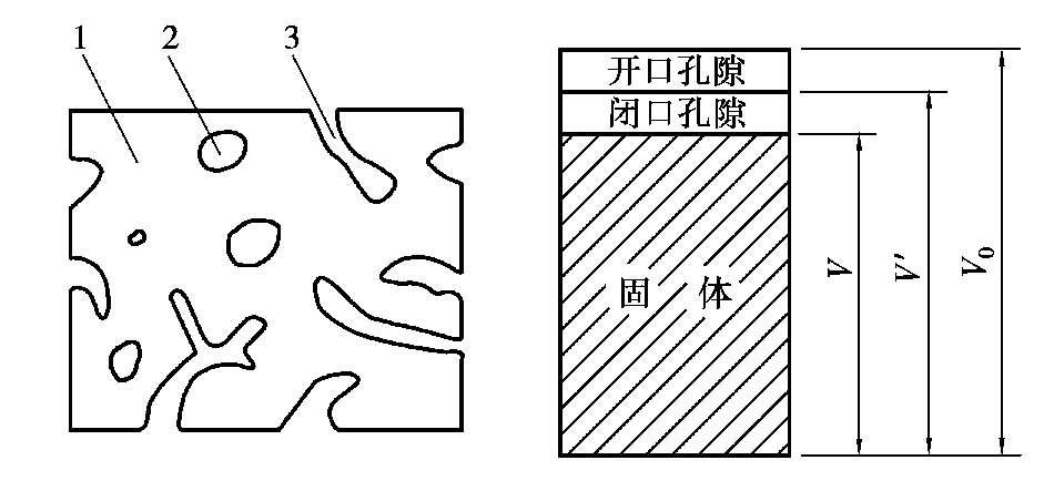 1—固体体积;2—闭口孔隙;3—开口孔隙