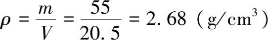 【 实例 2.1】 一块烧结普通砖的外形尺寸为240 mm×115 mm×53 mm,吸水饱和后质量为2 900 g,烘干至恒重的质量为2 665 g,切下一小块磨细后取干粉55 g,用李氏瓶法测得其迷失状态下的体积为20.5 cm 3 。求此砖的密度和体积密度。