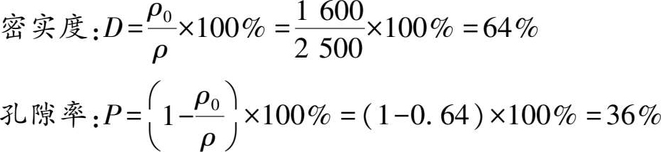【 实例 2.2】 已知某普通黏土砖 ρ 0 = 1 600 kg/m 3 , ρ = 2 500 kg/m 3 。求其密实度和孔隙率。