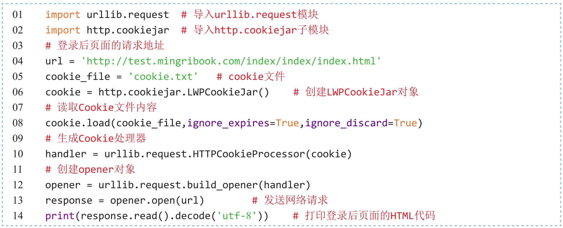 获取登录后页面的请求地址之后,接下来只需要使用cookie.txt文件中的Cookie信息发送请求,便可以获取登录后页面中的用户名信息。代码如下: