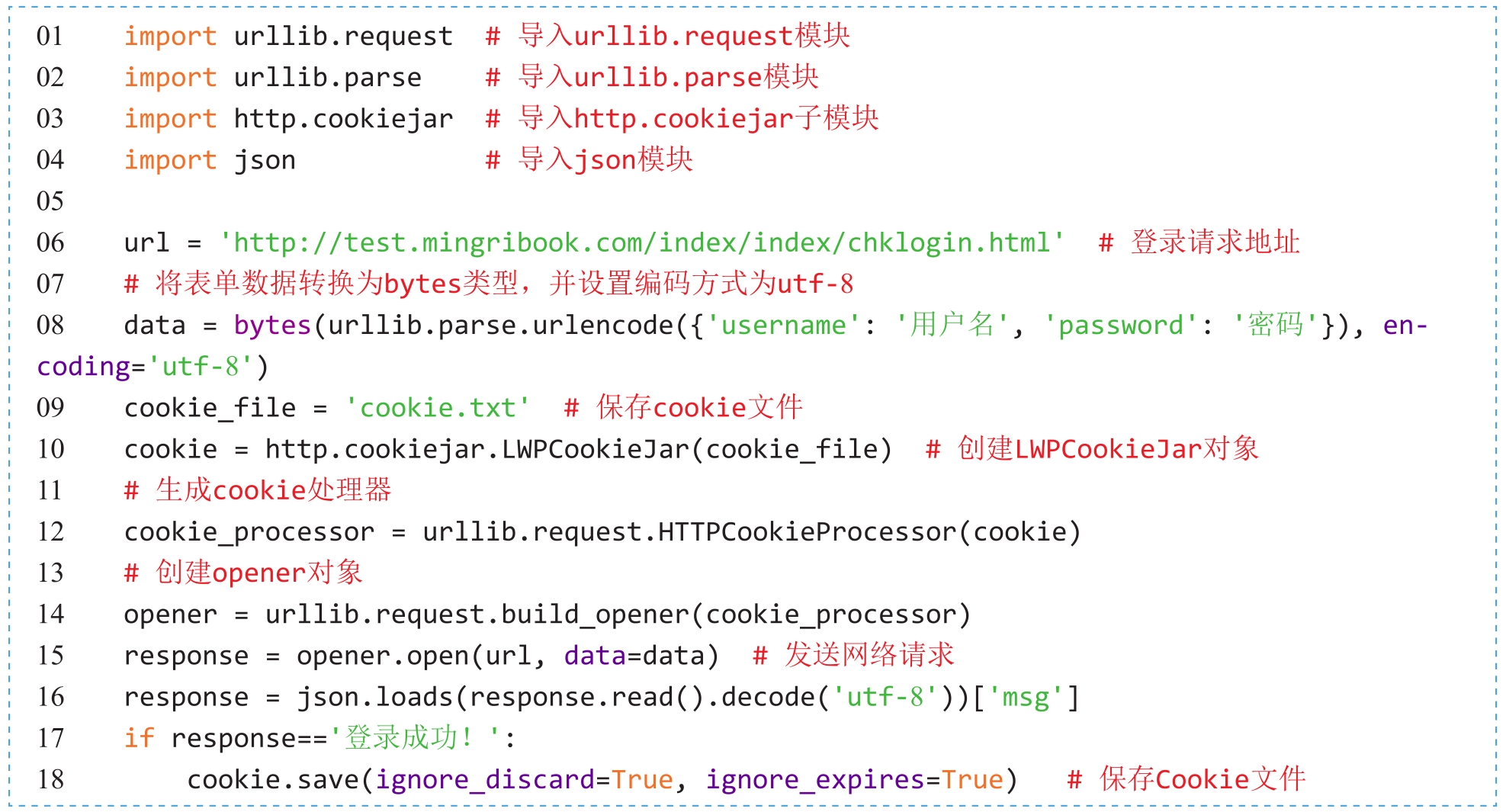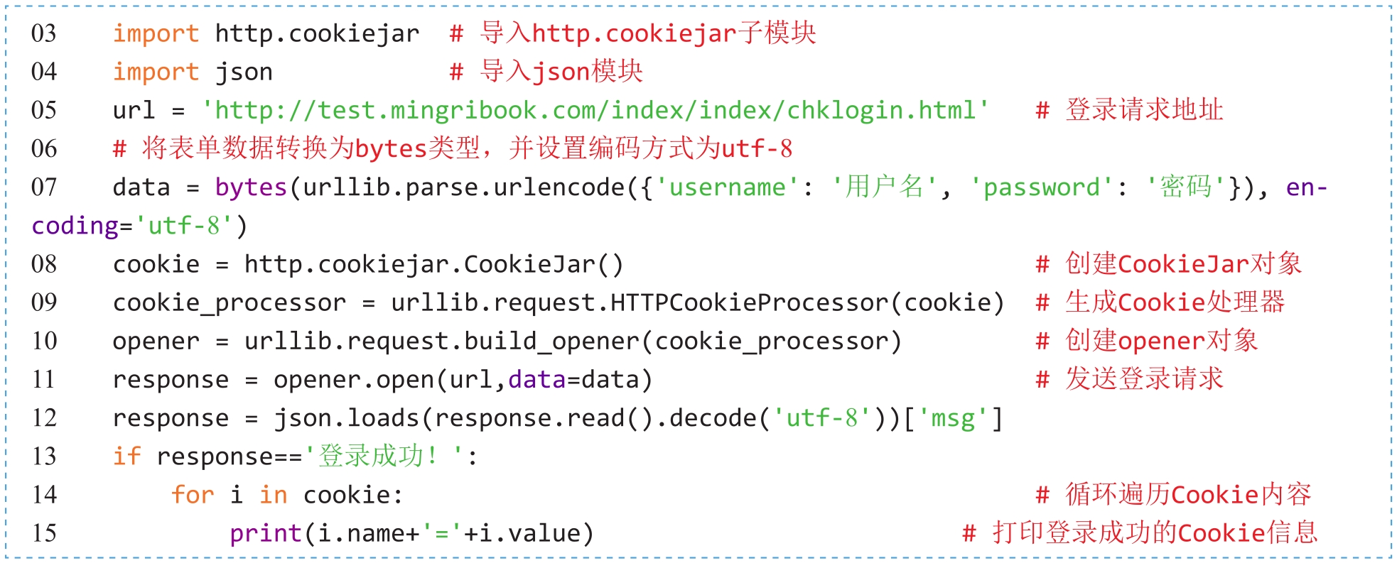 上一节已经成功地通过爬虫实现了网页的模拟登录,接下来需要实现在模拟登录的过程中获取登录成功所生成的Cookie信息。在获取Cookie信息时,首先需要创建一个CookieJar对象,然后生成Cookie处理器,接着创建opener对象,再通过opener.open()发送登录请求,登录成功后获取Cookie内容。代码如下: