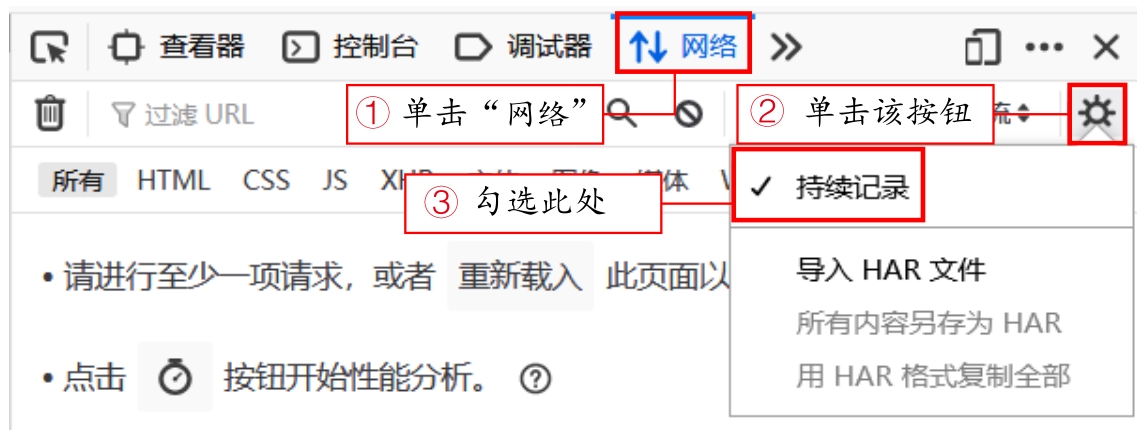 (2)按下“F12”键,打开“开发者工具”,接着单击顶部工具栏中的“网络”,再单击右侧的设置按钮,勾选“持续记录”,如图2.11所示。