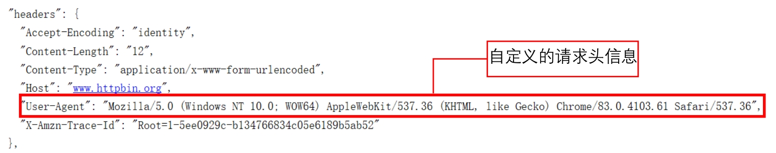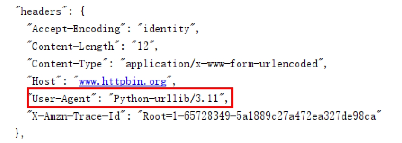 设置请求头参数是为了模拟浏览器向网页后台发送网络请求,这样可以绕过服务器的反爬措施。使用urlopen()方法发送网络请求时,其本身并没有设置请求头参数,所以向https://www.httpbin.org/post请求测试地址发送请求时,返回的信息中headers将显示如图2.4所示的默认值。