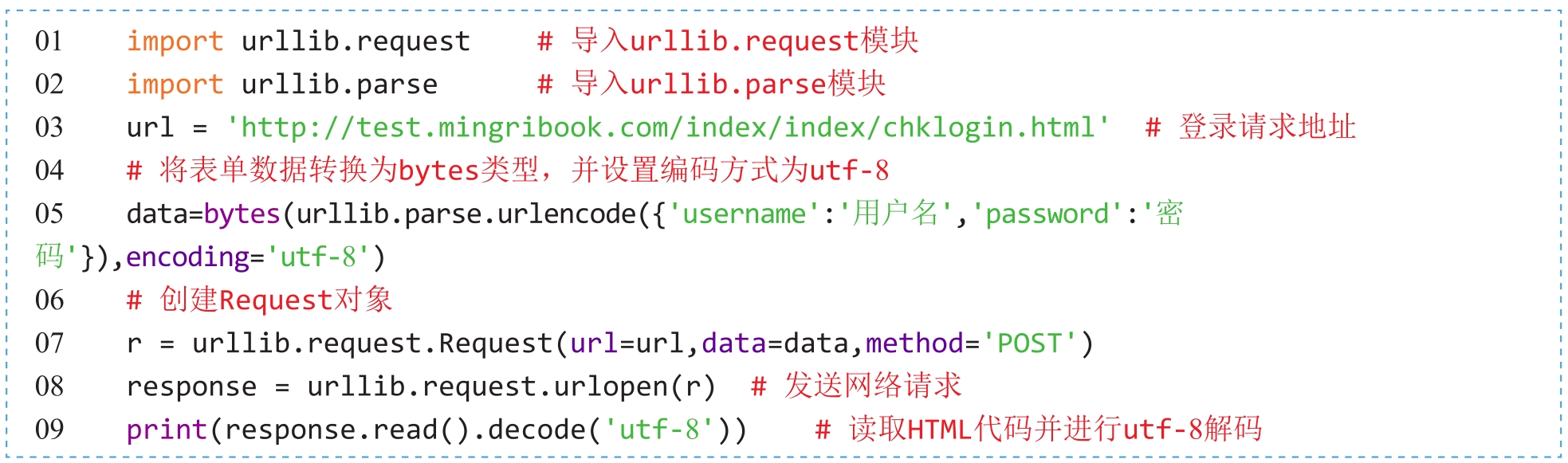 (5)获取了网页登录验证的请求地址与表单数据后,可通过urllib.request子模块中的POST请求方式,实现网页的模拟登录。代码如下: