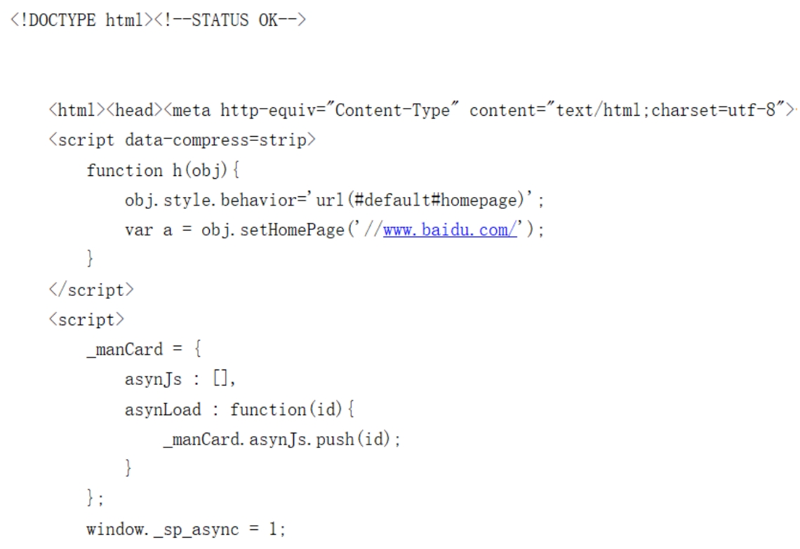 从实例2.4中并没有直观地看出设置请求头的好处,接下来以请求“百度”为例,测试设置请求头的绝对优势。在没有设置请求头的情况下直接使用urlopen()方法向https://www.baidu.com/地址发送网络请求,将返回如图2.7所示的HTML代码。