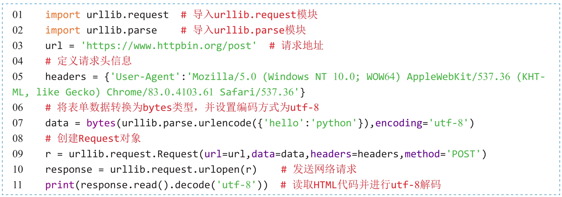 ☑ data:该参数默认为None,通过该参数确认请求方式,如果是None,则表示请求方式为GET,否则请求方式为POST。在发送POST请求时,参数data需要以字典类型的数据作为参数值,并且需要将字典类型的参数值转换为字节类型的数据才可以实现POST请求。