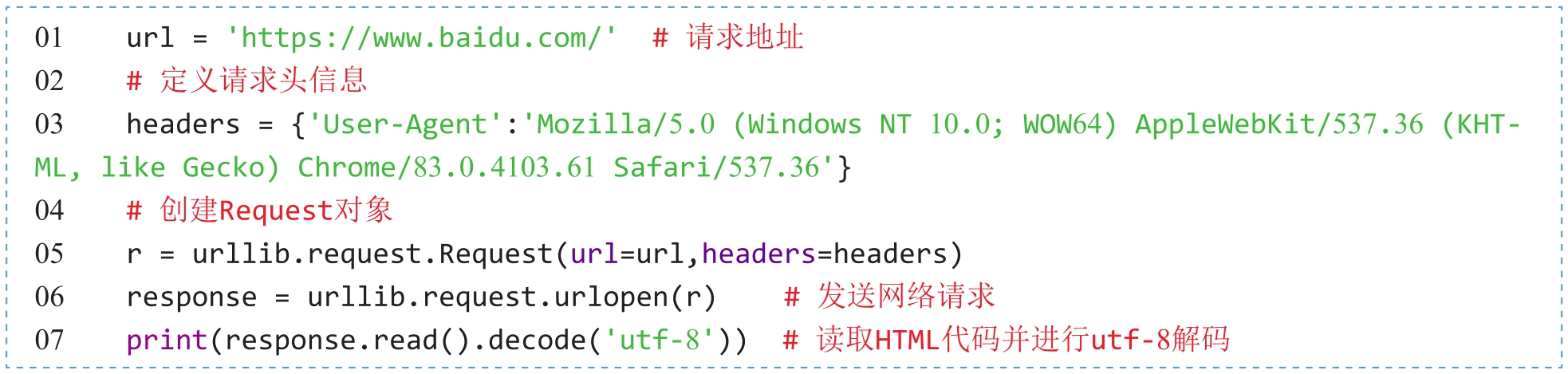首先创建具有请求头信息的Request对象,然后使用urlopen()方法向“百度”地址发送一个GET请求。关键代码如下: