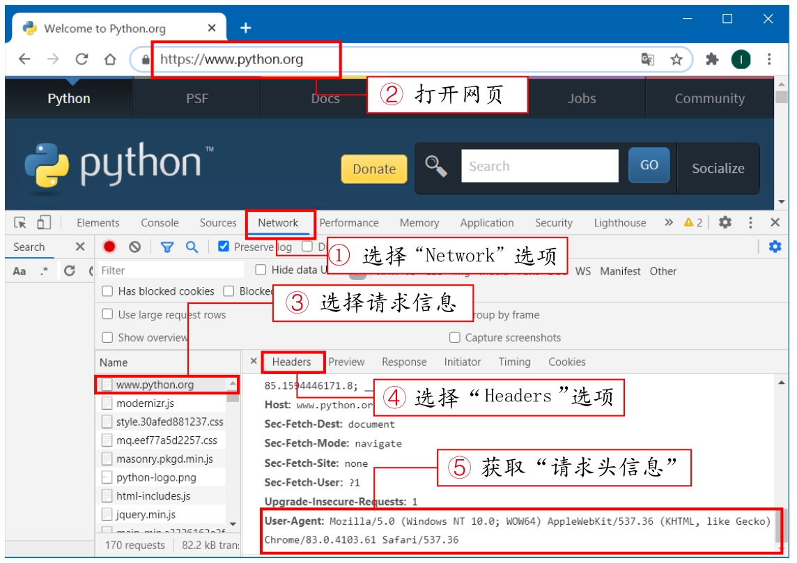 所以在设置请求头信息前,需要在浏览器中找到一个有效的请求头信息。以谷歌浏览器为例,首先按下“F12”键打开“开发者工具”,然后选择“Network”,接着在浏览器地址栏中打开任意一个网页(如https://www.python.org/),在请求列表中选择一项请求信息,最后在“Headers”选项中找到请求头信息。具体步骤如图2.5所示。