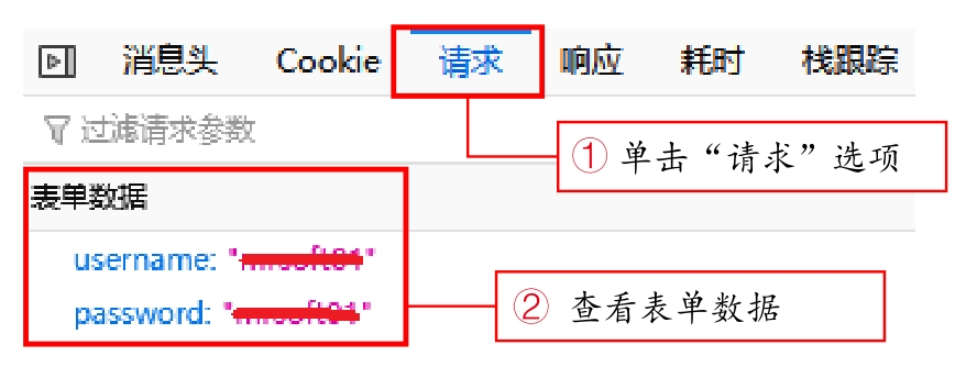 (4)在图2.12中已经找到了登录验证的请求地址,接着在“登录验证请求地址”的上方单击“请求”选项,获取登录验证请求所需要的表单数据,如图2.13所示。