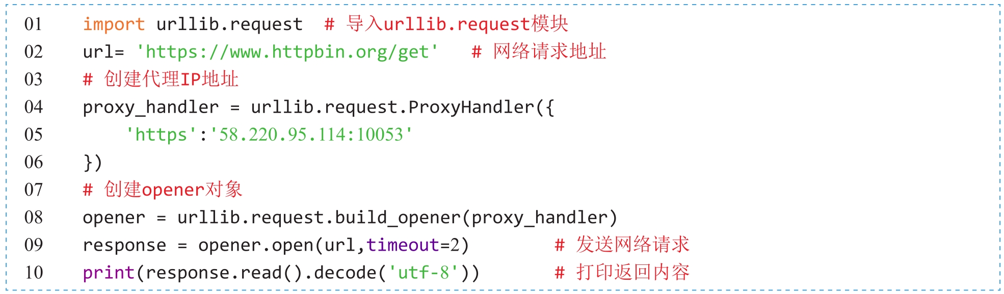 使用urllib模块设置代理IP地址是比较简单的,首先需要创建ProxyHandler对象,其参数为字典类型的代理IP地址,键名为协议类型(如HTTP或者HTTPS),值为代理链接。然后利用ProxyHan-dler对象与build_opener()方法构建一个新的opener对象,最后发送网络请求即可。代码如下: