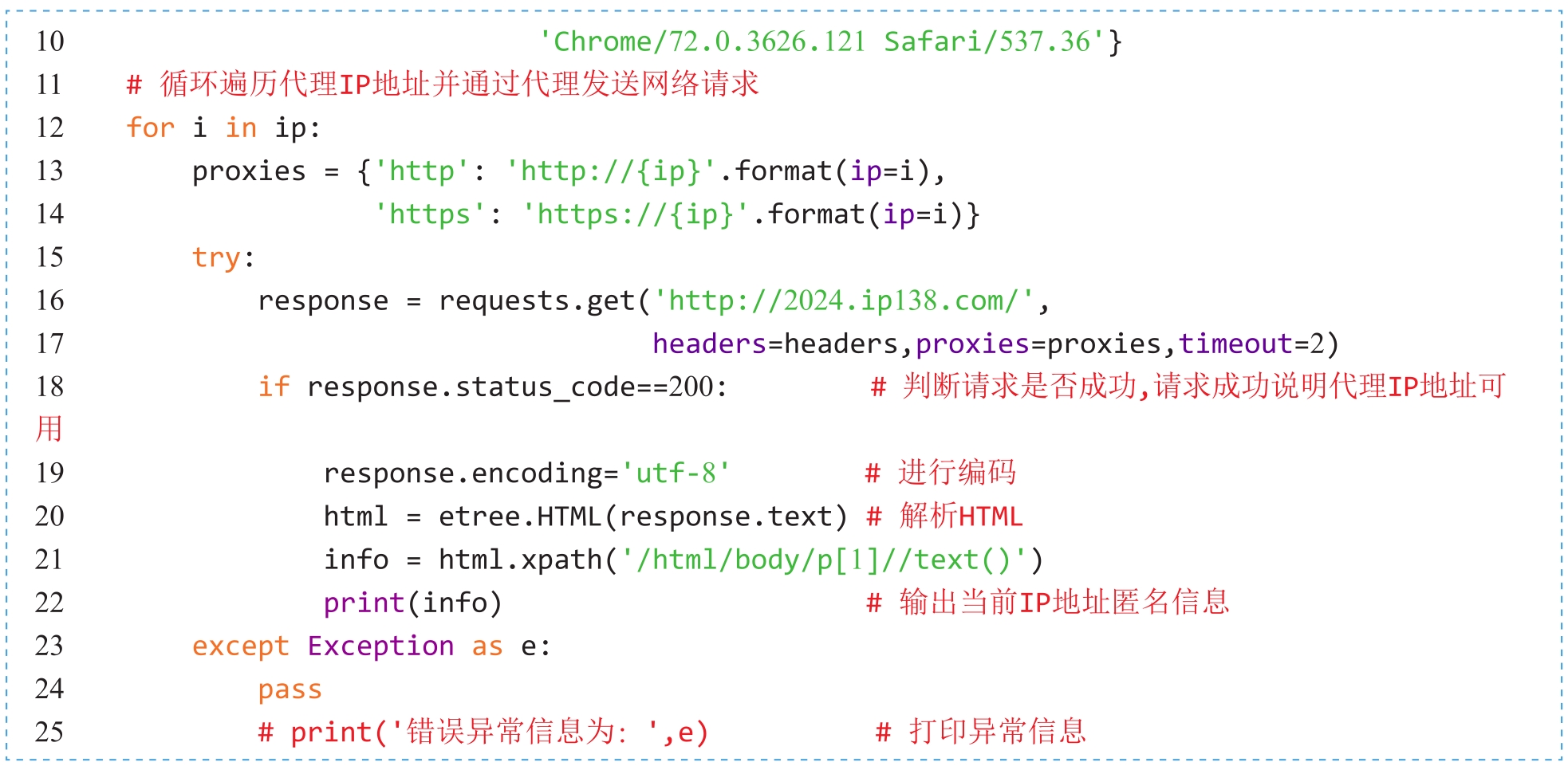 实现检测免费代理IP地址是否可用时,首先需要读取保存免费代理IP地址的文件,然后对代理IP地址进行遍历,并使用免费的代理IP地址发送网络请求,而请求地址可以使用查询IP地址位置的网页。如果网络请求成功,则说明免费的代理IP地址可以使用,而且还会返回当前免费代理IP地址的匿名地址。代码如下: