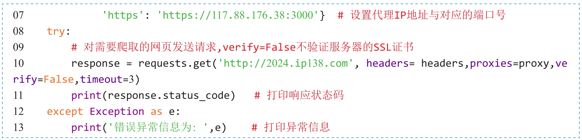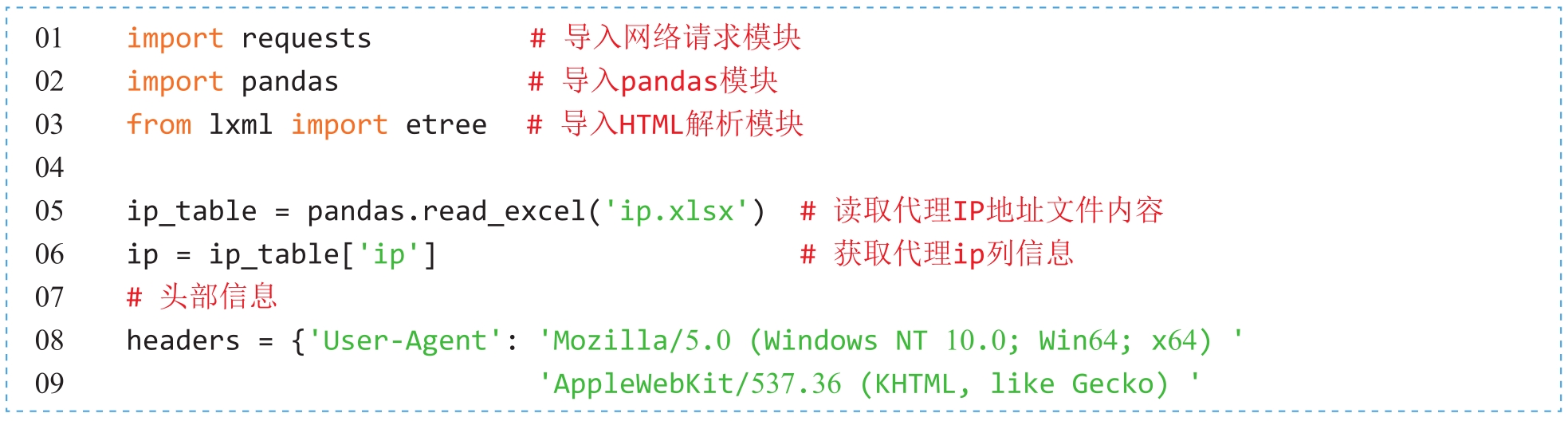 为了避免爬取目标网页的后台服务器对我们实施封锁IP地址的操作,我们可以每发送一次网络请求就更换一个IP地址,从而降低被发现的风险。其实在获取免费的代理IP地址之前,需要先找到提供免费代理IP地址的网页,然后通过爬虫技术将大量的代理IP地址提取并保存至文件。提供免费代理IP地址的网站很多,用户可以通过搜索引擎查询,或者参考本书附带的“AI辅助编程”视频,通过现在流行的AI工具去查询。