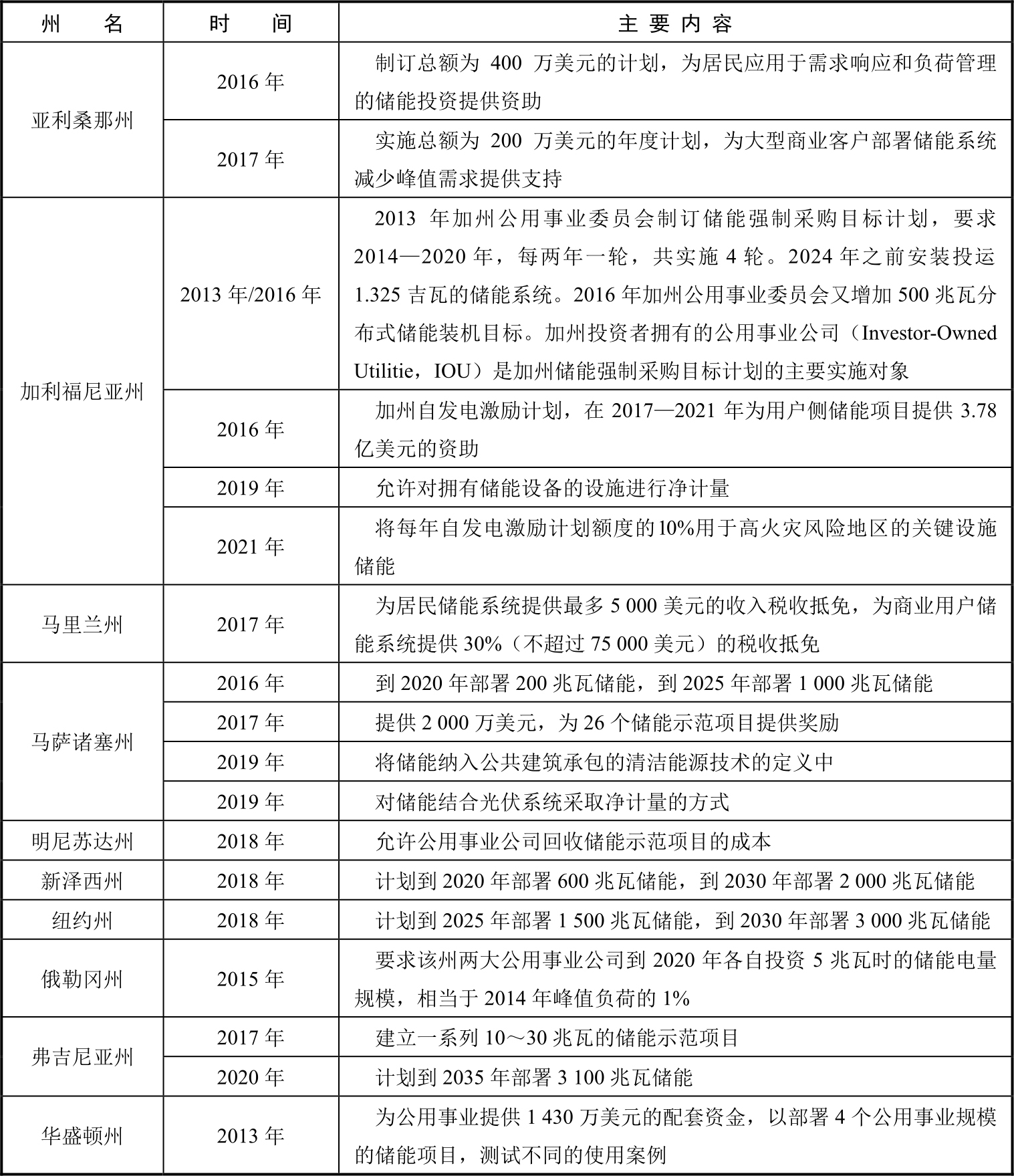 根据美国联邦体制,各州在电力市场监管和储能发展上的政策也是相对独立的。除联邦政府层面对储能进行支持外,美国各州也陆续设立了相应的储能目标和策略,推动储能项目落地与发展,如表1-3所示。目前已有大约15个州正式颁布了至少一项旨在消除储能障碍的实质性立法或监管政策,其他各州也正在开放监管文件和制定法规等方面进行努力。其中,加州是政策驱动型机制推动储能发展的典型代表。加州于2008年将储能纳入自发电计划,对用户安装储能系统进行补贴,补贴标准约为200美元/千瓦时。2013年,加州公用事业委员会(CPUC)制订储能强制采购目标计划,要求在2024年之前安装投运1.325吉瓦的储能系统,之后又将该目标提升至1.825吉瓦。2020年2月21日,加州公用事业委员会在其综合资源规划(Integrated Resource Planning,IRP)中提出到2030年加州将部署装机容量为5.9吉瓦的太阳能发电设施和装机容量为2.1吉瓦的电池储能系统。此外,马萨诸塞州、新泽西州、弗吉尼亚州等多个州都设立了储能装机的具体目标,各州规划的储能装机容量均超过8吉瓦。