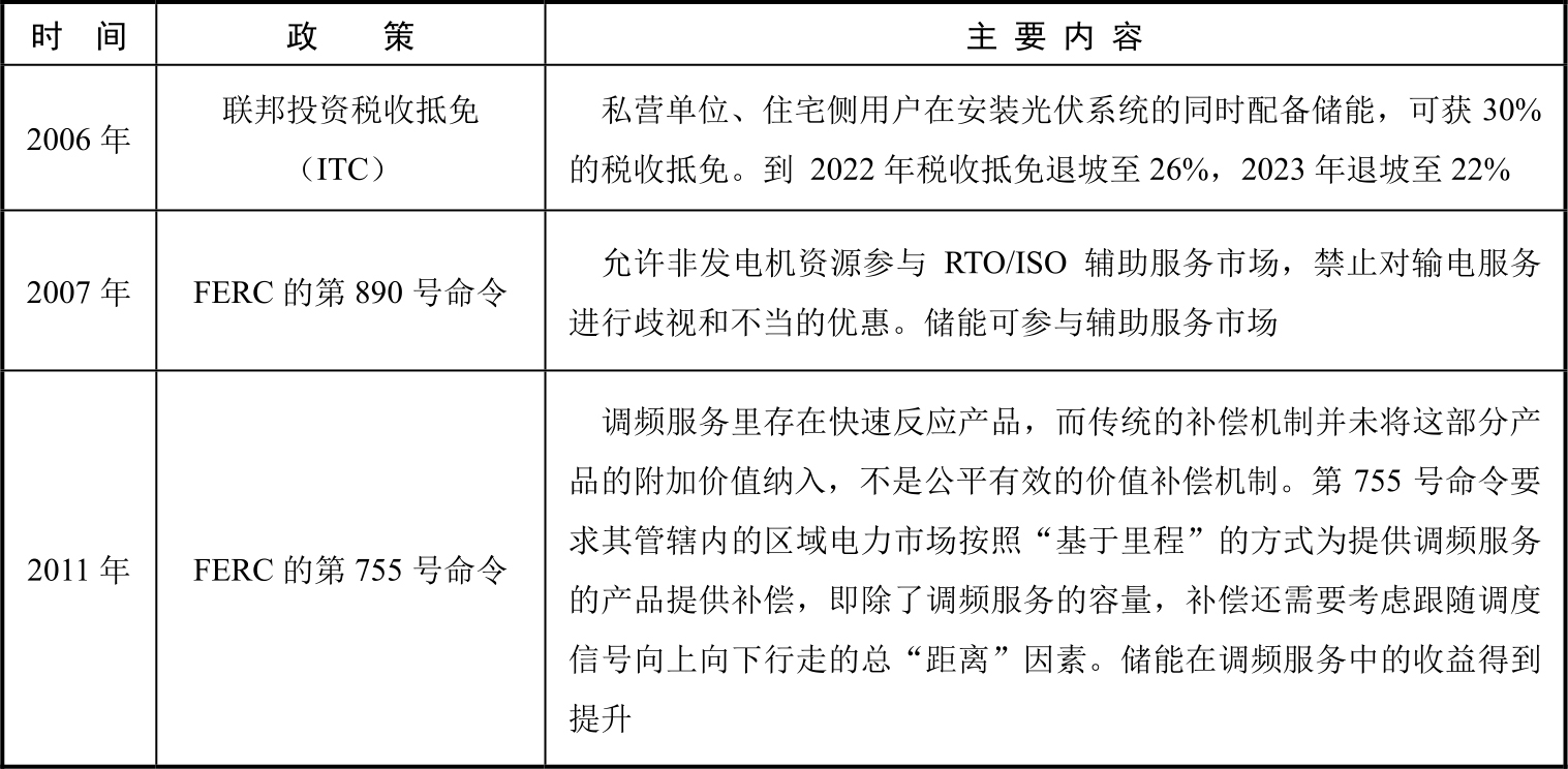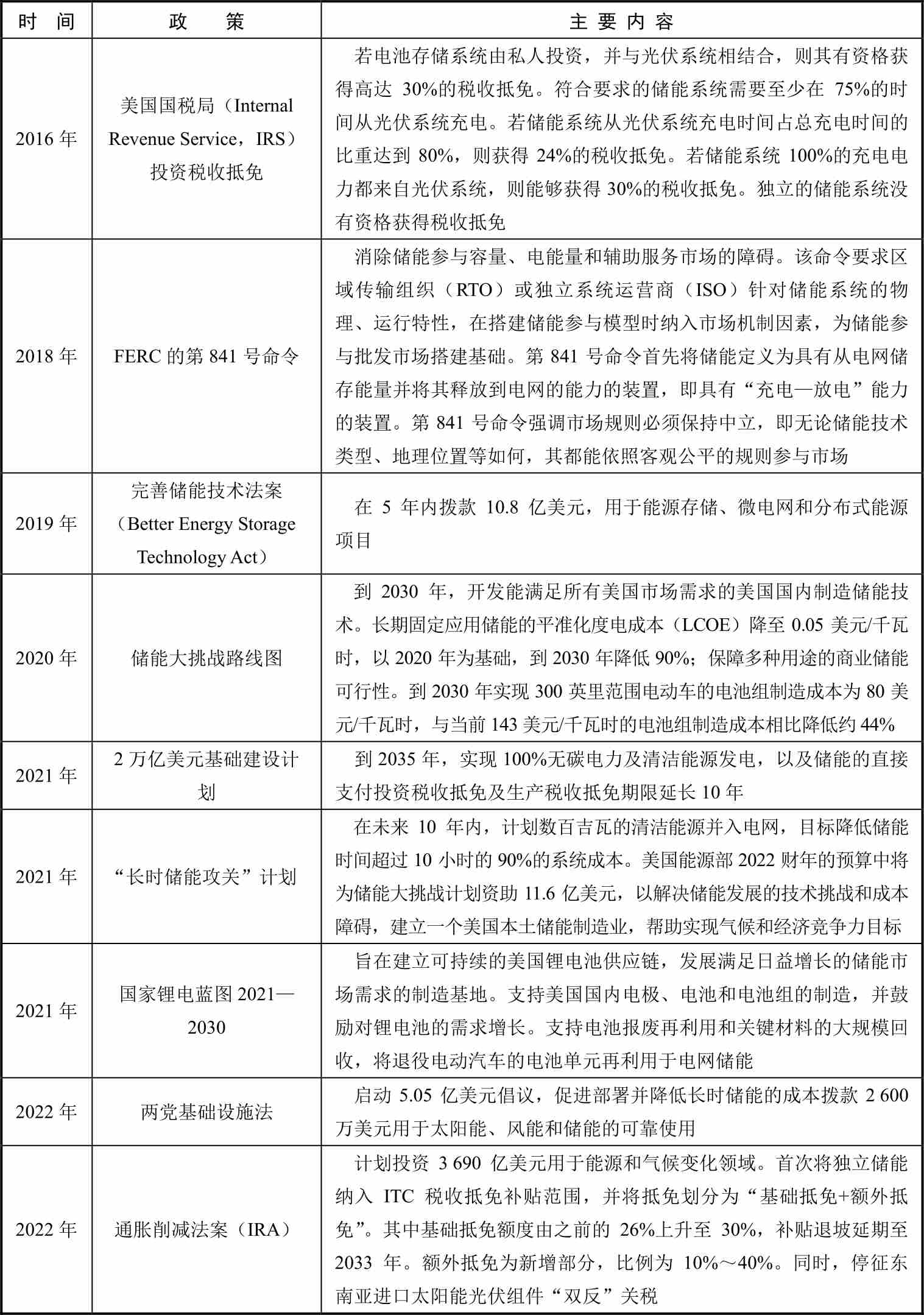 过去10多年间,美国联邦政府及各州相继推出了一系列政策法规以推动储能的发展。联邦层面包括美国能源管理委员会(FERC)在内的机构发布了一系列法令或文件,以及一系列储能投资税收抵免政策,如表1-2所示。