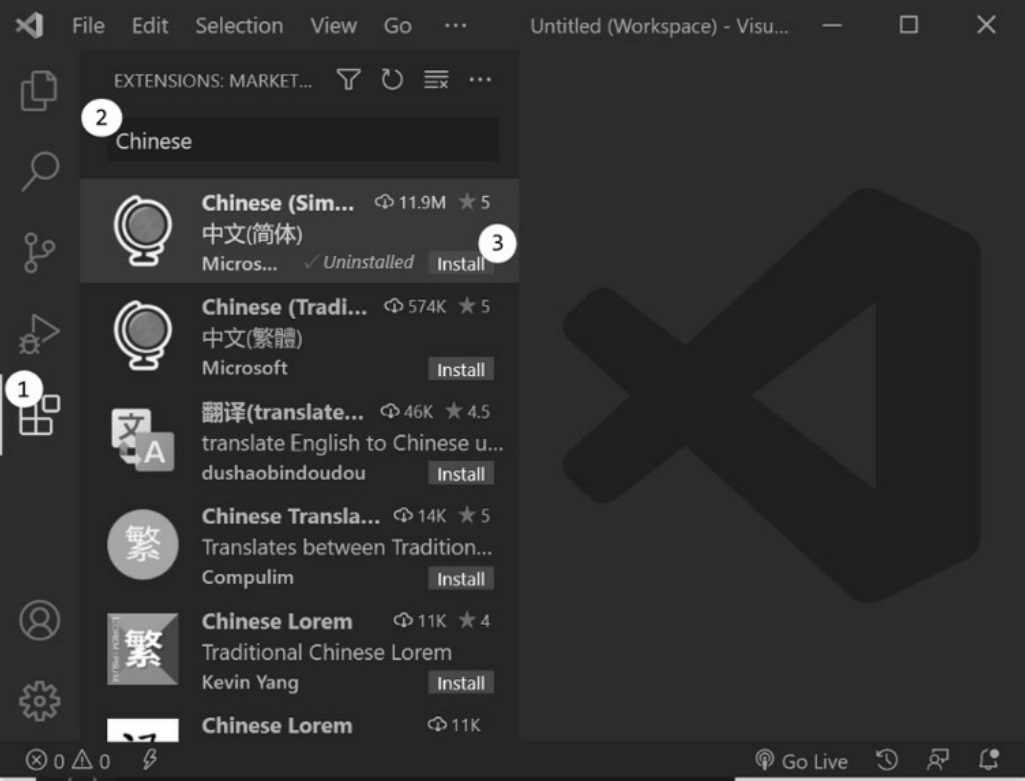 为了让Visual Studio Code显示中文界面,还需要安装相关扩展。点击图1-11中①所对应的“扩展”按钮,在②所示的输入框中输入“Chinese”并按Enter键,即可在扩展商店中搜索相关插件。在找到“Chinese(Simplified)”插件后,点击③所示的“Install”按钮,即可完成插件安装。在重启Visual Studio Code后,软件将显示中文界面。在软件界面变为中文后,读者就可以自行查看并熟悉Visual Studio Code菜单栏的相关内容了。