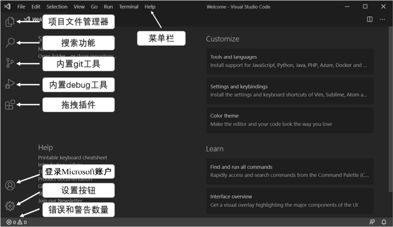 Visual Studio Code的安装过程非常简单,本书不再赘述。在安装完成后启动软件,其界面如图1-10所示。