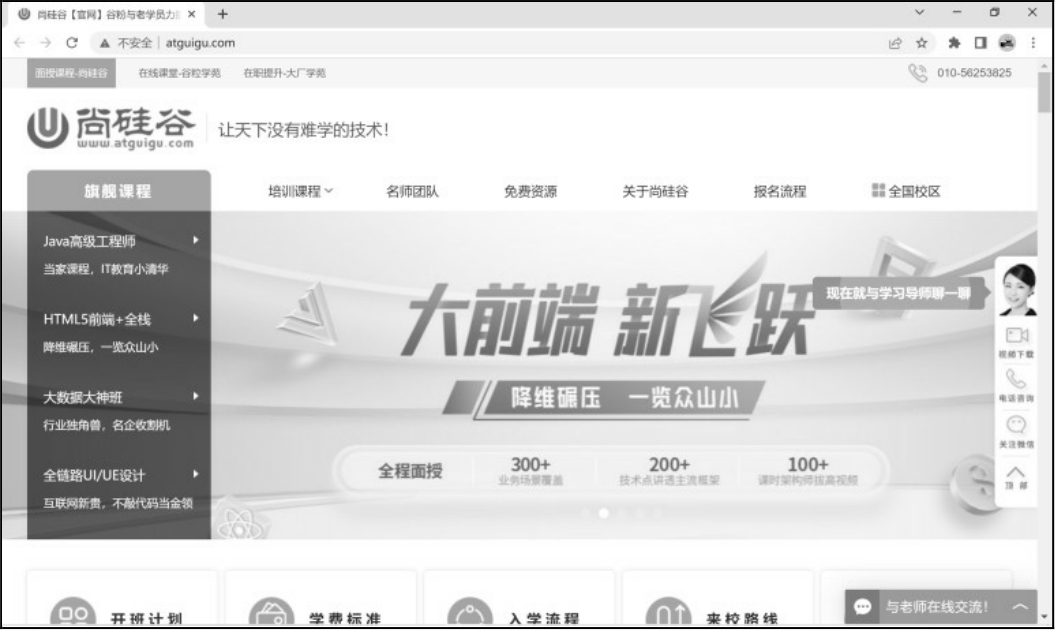 B/S的全称为Browser/Server,中文译为浏览器和服务器架构,是网站级网络软件架构。我们访问在一个网站时,通常会在客户机上启动一个浏览器(如Chrome或Microsoft Edge等),接着输入网址,按Enter键后在浏览器中就会显示网站的内容。这里以Chrome浏览器为例,输入尚硅谷官方网址,按Enter键后会显示尚硅谷官网首页,如图1-7所示。