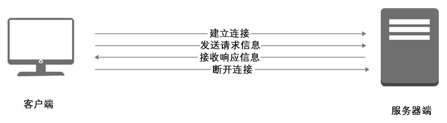 在输入一个URL地址或点击某个超链接之后,客户端会与服务器端建立连接,接着客户端会发送一个请求给服务器端(请求信息),服务器端在接收请求后会给予响应(响应信息),客户端在接收到服务器端返回的信息并经过处理后会将其显示出来,之后客户端和服务器端断开连接。上面描述的发送、请求过程如图1-3所示。