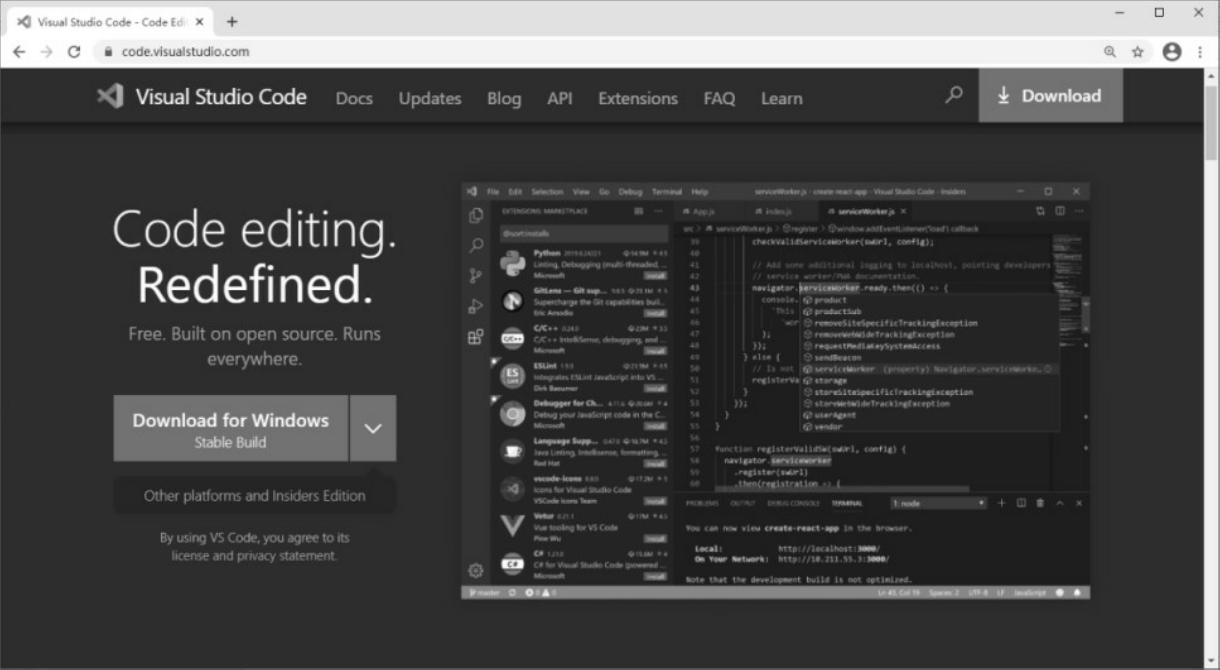 本书编写代码选择的编辑器是Visual Studio Code。下面就以Visual Studio Code为例,讲解它的安装和使用方式。当然,读者也可以多试几款IDE工具,从中选择出最适合自己的一个,让它成为最顺手的“武器”。
