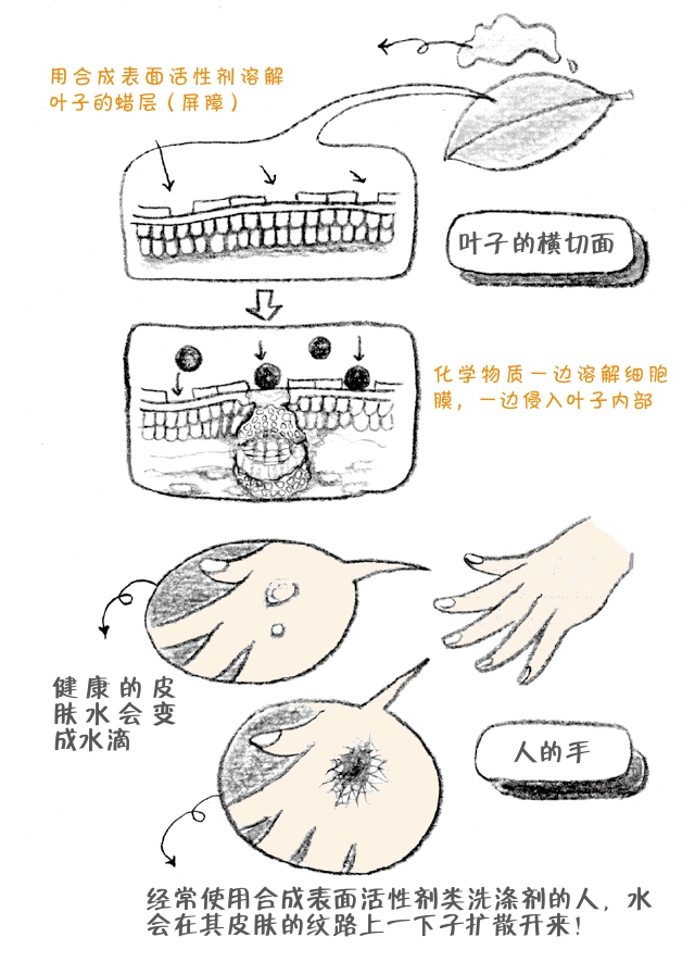 本来即便是植物的叶子这般单纯的组织结构,让化学物质从外部渗透进去也不是一件简单的事情。然而在日用品中广为使用的合成表面活性剂和溶解剂的作用下,从外部摄入有害化学物质就成为可能了。