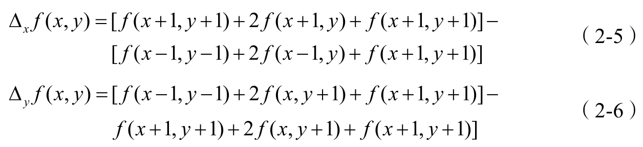 在求取边缘时,对图像中的每个像素运用上面的方法计算。在实际中,经常使用对应小区域模板进行卷积来计算,两个模板构成一个梯度算子,如图2-2、图2-3所示。