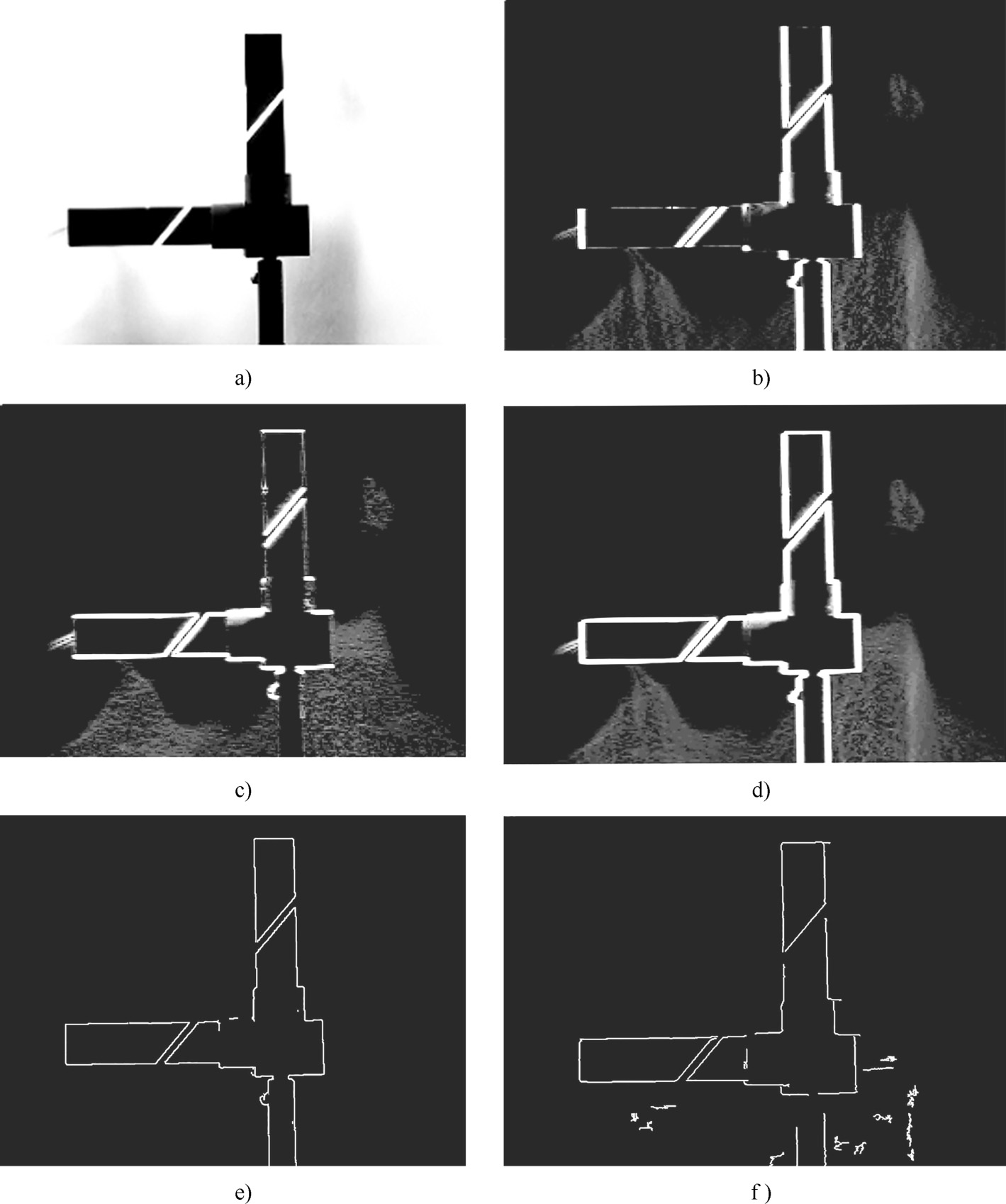 a)灰度图 b)垂直方向小波变换 c)水平方向小波变换 d)小波变换模 e)小波变换零件边缘图 f)由Roberts算子检测的边缘图