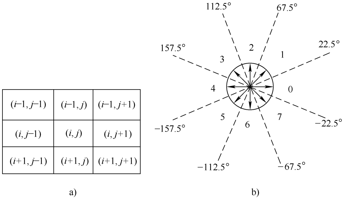 a)数字图像的邻域结构 b)邻接点划分的8个区域