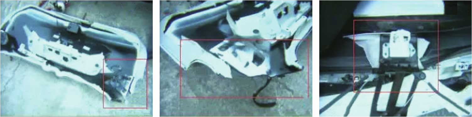 我们能发现事故车尾门锁的残部还留在车上,尾门上部的安装点(支撑杆、铰链)出现了明显的撕裂痕迹,尾门的主体件(除车窗外的下盖板)未出现严重损坏,如图1-26所示。可以大致判断:尾门被撞飞不是车锁与车身连接强度不够造成的,可以排除车身和车锁的问题。