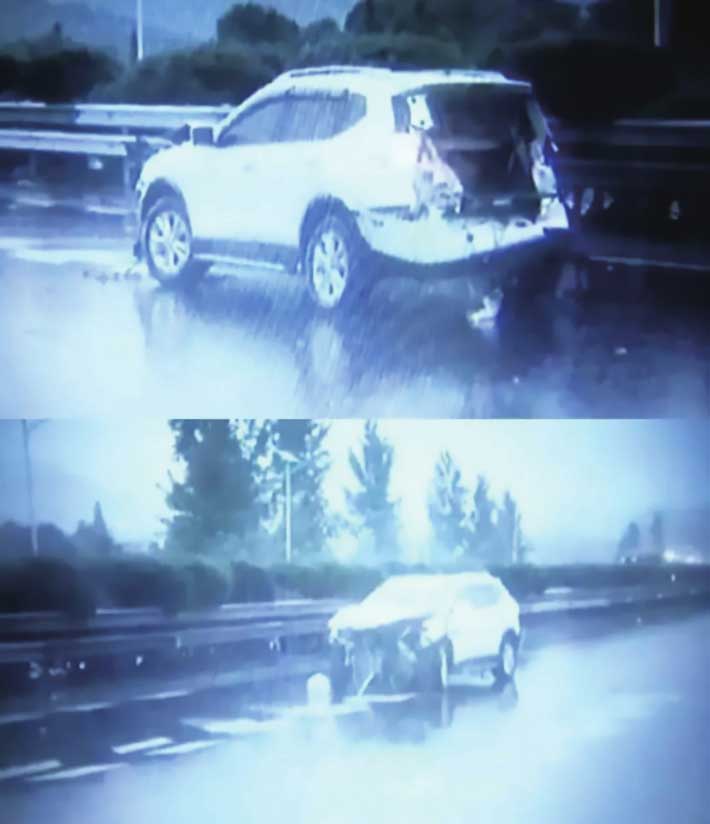 2018年6月,一辆SUV在高速公路上突然偏离方向,撞向了路中间的隔离栏,车尾发生二次碰撞,车尾门被撞飞,位于后座的车主父亲和两个儿子被甩出车外(图1-20)。该事故导致车主父亲高位截瘫、妻子肋骨骨折、七岁的大儿子擦伤、三岁的小儿子死亡。车主在接受采访时说:“怎么我们车子的后尾箱是塑料的?别人的车子全是铁的嘛,如果是铁的话,也不可能会折断,门也不可能飞出去,就算是在车里受了伤,也不可能这么严重。”