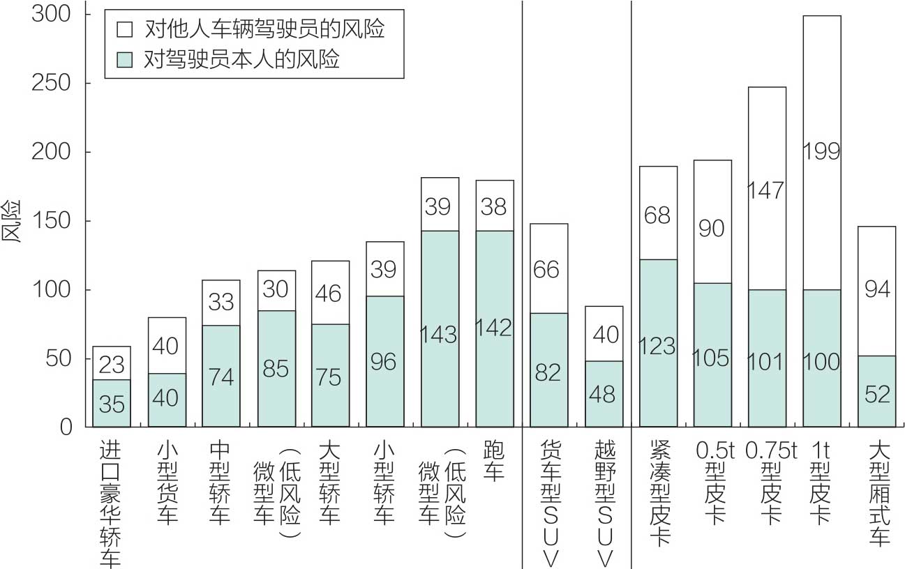 他们还通过分析不同级别车型的风险因数发现,皮卡并没有想象中的那么安全,如图1-23所示。中大型轿车和小型货车的安全性反而较高;皮卡的安全性最低,同时对他人车辆的侵略性最高,在两车相撞事故中,很容易导致他人死亡;但同时,皮卡本身在与静止物体(比如墙体)碰撞的事故中驾驶员死亡率也很高。