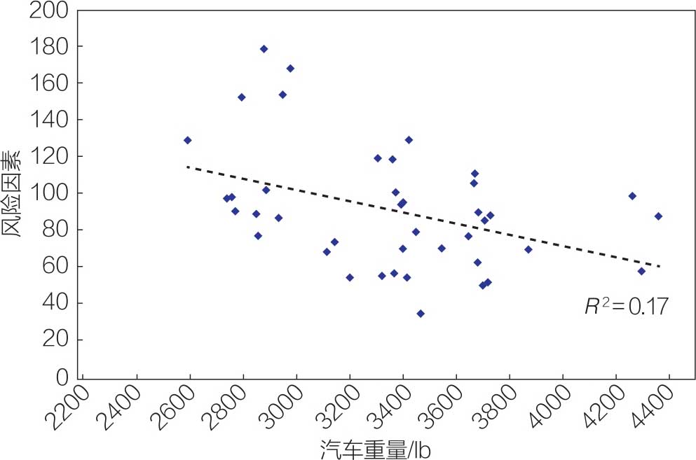 图1-22 横轴为汽车重量,纵轴为风险因数(风险因数的定义为每年每一百万辆车中的事故死亡率)
