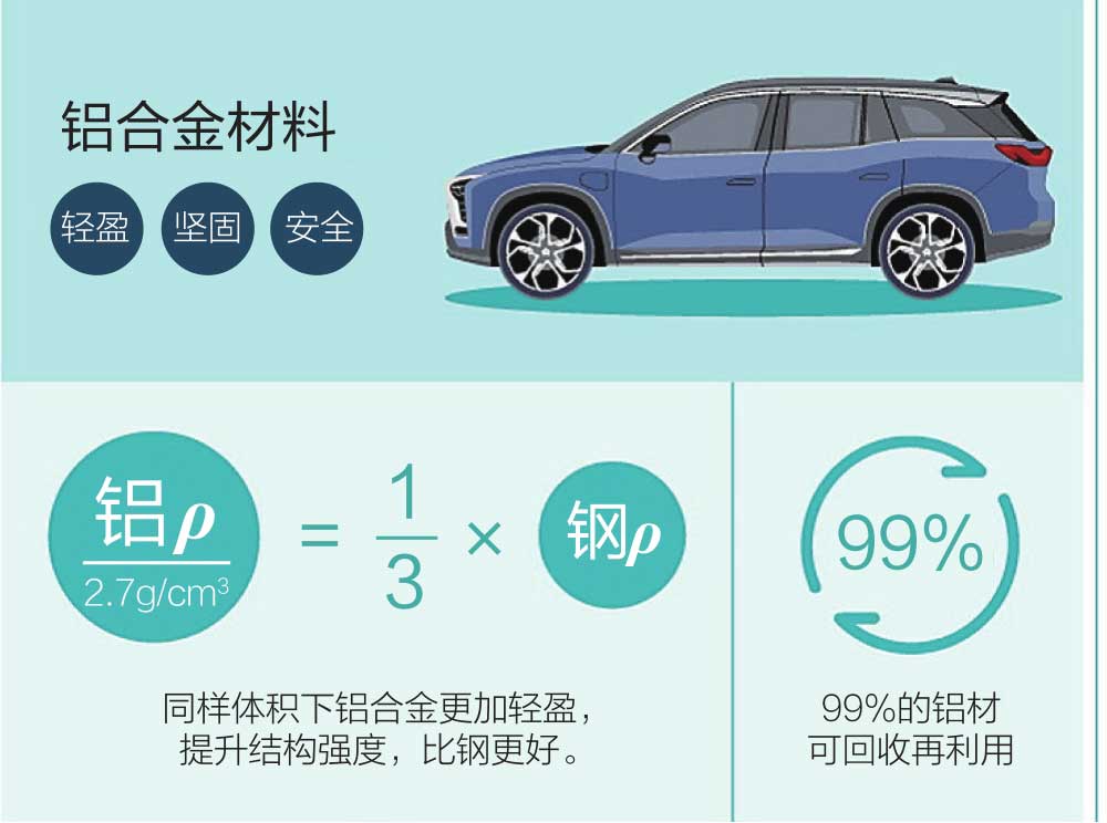 轻量化材料是实现汽车轻量化的关键,如高强度钢材、铝合金、镁合金、碳纤维复合材料等。这些材料相比传统的钢铁材料具有更高的强度和刚度,同时重量更轻。如图1-16所示的蔚来ES8,是其首个独立研发量产的轻量化全铝车身平台。在车身最关键的传力路径和承载部位上,ES8也使用了高性能铝材。这使得ES8全铝车身上铝材的使用率高达96.4%,成为当时全球量产的全铝车身中铝材应用量比例最高的车型。
